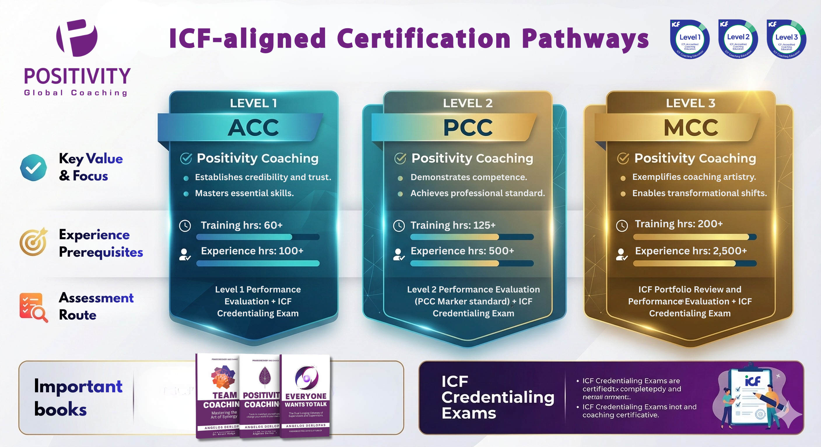 Level 3 with Positivity Coaching Academy offers 86 hrs of training. Graduates from Diploma in Masterful Coaching education training program may apply for the Master Certified Coach (MCC) Credential if they meet the credentialing application standards. View sample application.